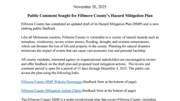 FILLMORE COUNTY NEWS RELEASE November 20, 2025 Public Comment Sought for Fillmore County’s Hazard Mitigation…